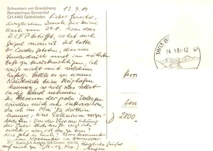 13869927 alte Postkarte Gelterkinden BL Schwestern von Grandchamp Retraitenhaus Sonnenhof Fliegeraufnahme postalisch gelaufen Erhaltung siehe scans [FriedD77] KatCode: 11470040095704