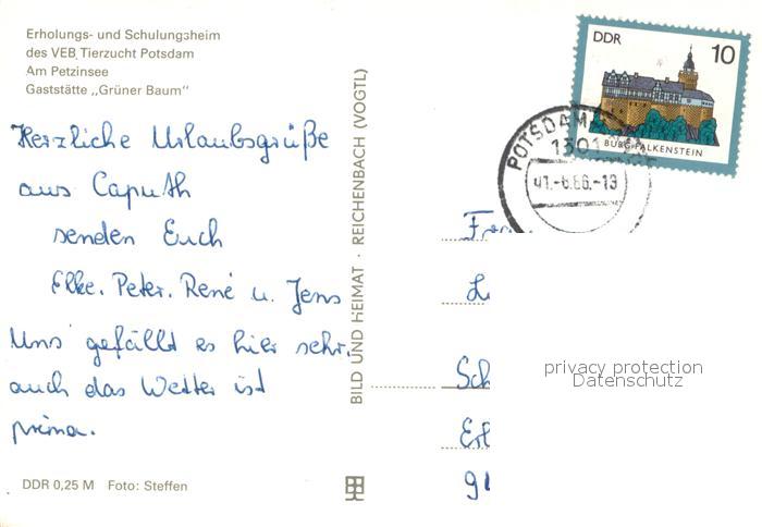 73722966 alte Postkarte Geltow Erholungs und Schulungsheim des VEB Tierzucht Potsdam Am Petzinsee Gaststaette Gruener Baum postalisch gelaufen Erhaltung siehe scans [WerneD78] KatCode: 11110012069590