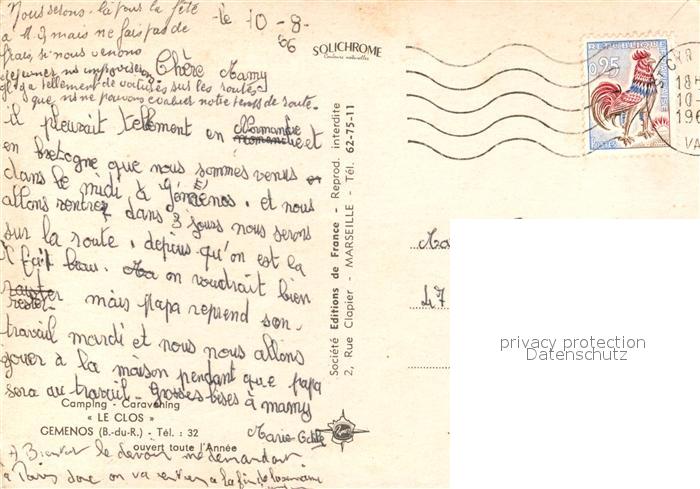 13581425 carte postale Gemenos Camping Caravaning Le Clos postalisch gelaufen Erhaltung siehe scans [WerneD78] KatCode: 11170013313042