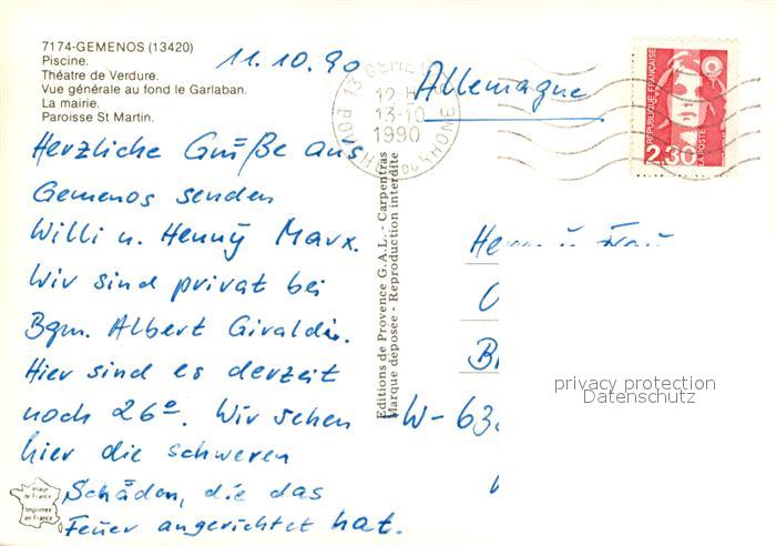 13362107 carte postale Gemenos Panorama Piscine Théâtre Garlaban la Mairie Paroisse Saint Martin postalisch gelaufen Erhaltung siehe scans [FriedD77] KatCode: 11170013313042