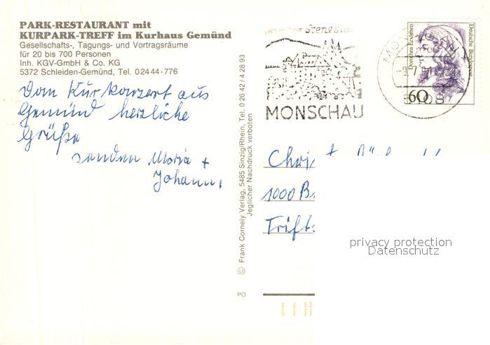 73097771 alte Postkarte Gemuend Eifel Park Restaurant Kurpark Treff Terrasse Bar postalisch gelaufen Erhaltung siehe scans [WerneD78] KatCode: 11110005366036