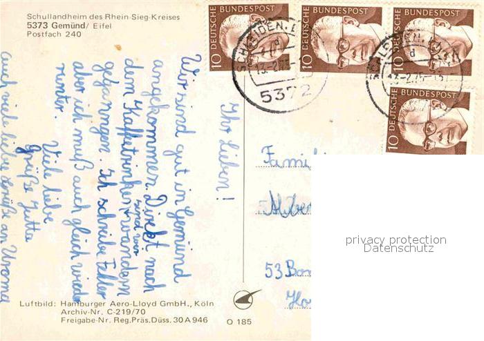 72724259 alte Postkarte Gemuend Eifel Schullandheim des Rhein Sieg Kreises Fliegeraufnahme postalisch gelaufen Erhaltung siehe scans [FriedD77] KatCode: 11110005366036