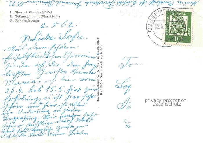 74041028 alte Postkarte Gemuend Eifel Teilansicht mit Pfarrkirche Bahnhofstrasse postalisch gelaufen Erhaltung siehe scans [WerneD78] KatCode: 11110005366036