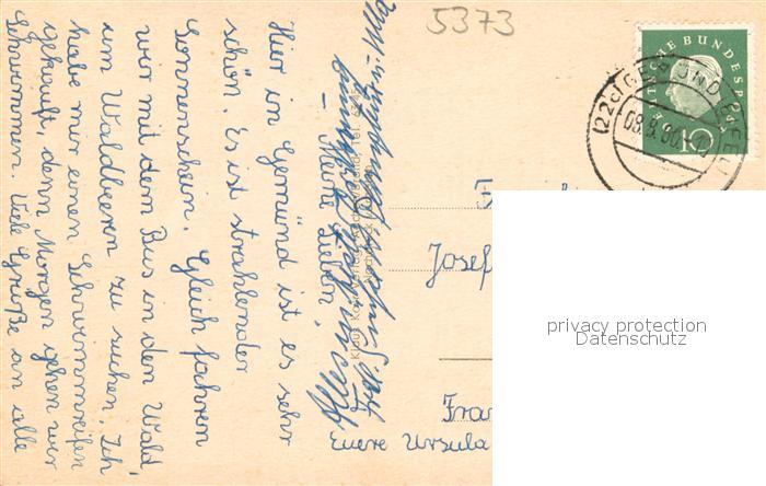 73689844 alte Postkarte Gemuend Eifel Teilansichten Kurstadt Denkmal Rurbruecke Burg Vogelsang Jugendherberge Schwimmbad Panorama postalisch gelaufen Erhaltung siehe scans [FriedD77] KatCode: 11110005366036