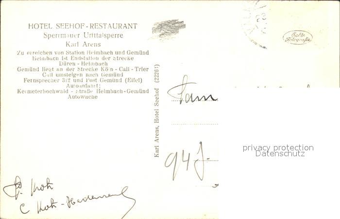 72432855 alte Postkarte Gemuend Eifel Urfttalsperre Sperrmauer Stausee Nationalpark Eifel Hotel Seehof Restaurant postalisch gelaufen Erhaltung siehe scans KatCode: 11110005366036