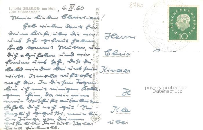 73765393 alte Postkarte Gemuenden Main Drei Fluesse Stadt Fliegeraufnahme postalisch gelaufen Erhaltung siehe scans [WerneD78] KatCode: 11110009677131