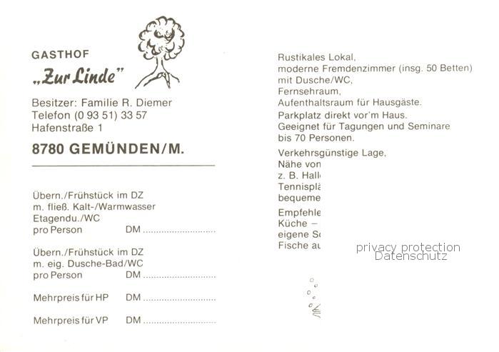 73862691 Gemuenden Main Gasthof Zur Linde Gastraeume Zimmer postalisch nicht gelaufen Werbekarte (keine Postkarte) Erhaltung siehe scans [WerneD78] Werbekarte (keine Postkarte) Wern Katcode 11110009677131