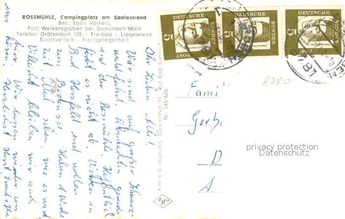 73645079 alte Postkarte Gemuenden Main Rossmuehle Campingplatz am Saalestrand Panorama postalisch gelaufen Erhaltung siehe scans [WerneD78] KatCode: 11110009677131