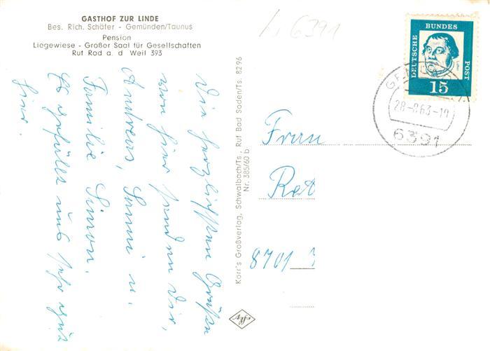 73869852 alte Postkarte Gemuenden Taunus Gasthof zur Linde Gastraeume postalisch gelaufen Erhaltung siehe scans [FriedD77] KatCode: 11110006434013