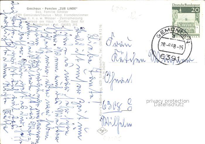 72098752 alte Postkarte Gemuenden Taunus Ortsblick Gasthaus Pension Zur Linde Gaststube Speisesaal postalisch gelaufen Erhaltung siehe scans KatCode: 11110006434013
