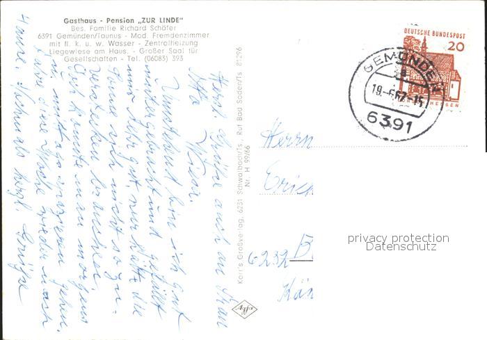 72098751 alte Postkarte Gemuenden Taunus Total Waldweg Pension Zur Linde Saal postalisch gelaufen Erhaltung siehe scans KatCode: 11110006434013