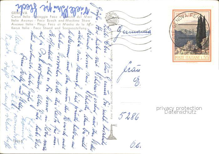 old postcard Genova Genua Liguria Corso Italia Spiaggia Foce e Mostra del Mare postalisch gelaufen Erhaltung siehe scans