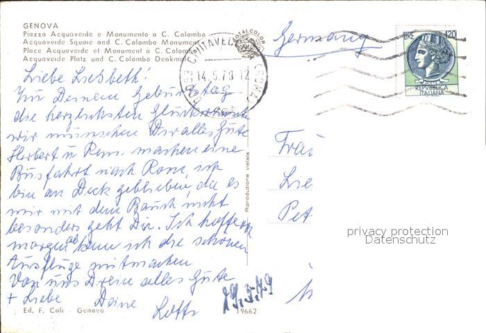 old postcard Genova Genua Liguria Piazza Acquacerde e Monumento a C. Colombo postalisch gelaufen Erhaltung siehe scans