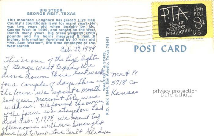 72306819 old postcard George West Big Steer postalisch gelaufen Erhaltung siehe scans KatCode: 14140460000000