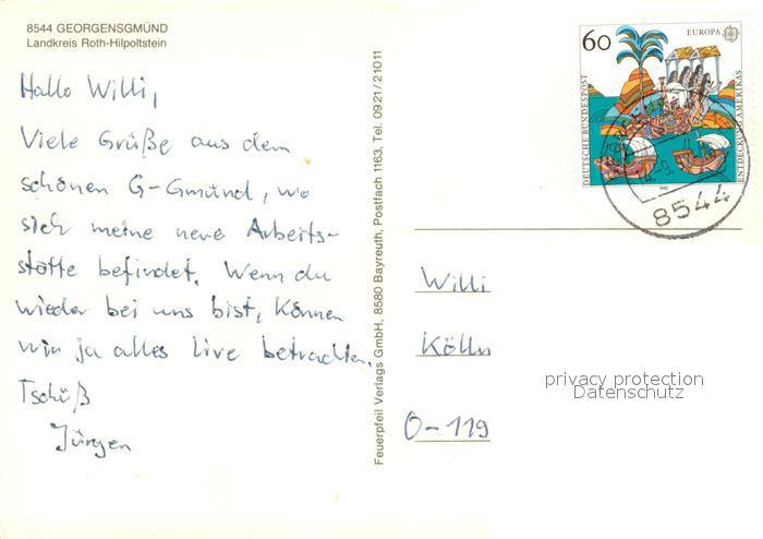 73669993 alte Postkarte Georgensgmuend Teilansichten Kirche Bruecke postalisch gelaufen Erhaltung siehe scans [WerneD78] KatCode: 11110009576121