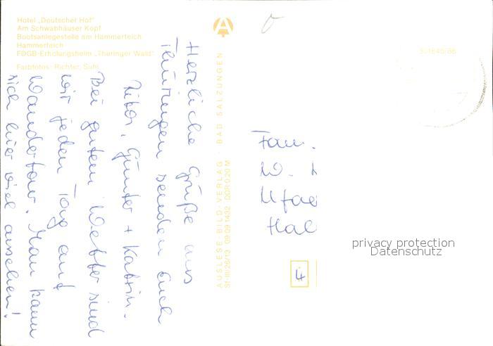 72056150 alte Postkarte Georgenthal Hotel Deutscher Hof Schwabhaeuser Kopf Anlegestelle Hammerteich FDGB Erholungsheim Thueringer Wald postalisch gelaufen Erhaltung siehe scans KatCode: 11110016067025