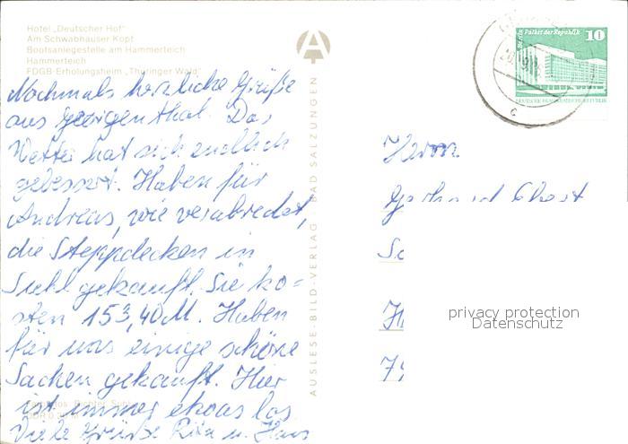 72332349 alte Postkarte Georgenthal Hotel Deutscher Hof Schwabhaeuser Kopf Bootsanlegestelle Hammerteich FDGB Erholungsheim postalisch gelaufen Erhaltung siehe scans KatCode: 11110016067025