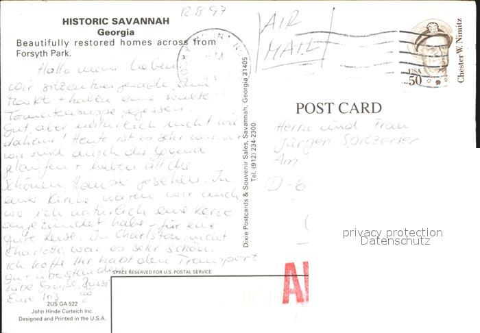 72499939 old postcard Georgia US-State Savannah Historic Homes postalisch gelaufen Erhaltung siehe scans KatCode: 14140120000000