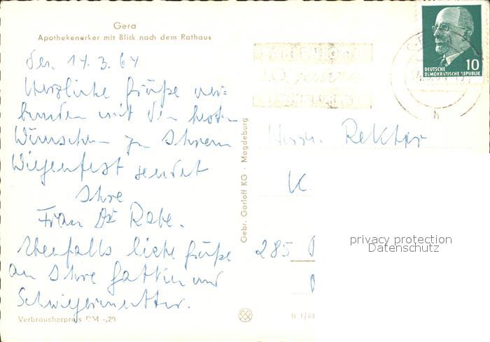 72085391 alte Postkarte Gera Apothekenerker mit Blick nach dem Rathaus postalisch gelaufen Erhaltung siehe scans KatCode: 11110016052000