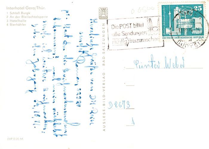 73900611 alte Postkarte Gera Burg Strand Interhotel Gera Rezeption Restaurant postalisch gelaufen Erhaltung siehe scans [WerneD78] KatCode: 11110016052000