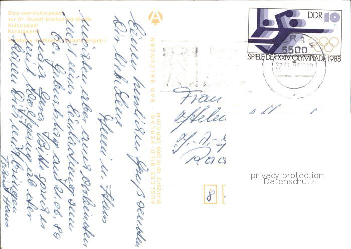 72329453 alte Postkarte Gera Dr Rudolf Breitscheid Strasse Wasserspiele Wohnblocks Kunstgalerie Kulturpalast Wappen postalisch gelaufen Erhaltung siehe scans KatCode: 11110016052000