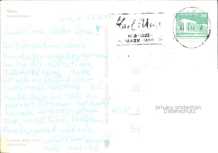 72418416 alte Postkarte Gera Interhotel Gera postalisch gelaufen Erhaltung siehe scans KatCode: 11110016052000