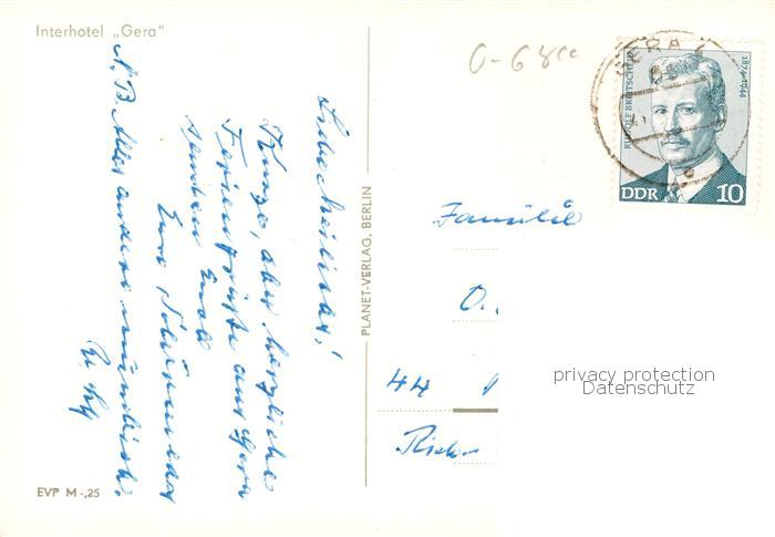 73865023 alte Postkarte Gera Interhotel Gera postalisch gelaufen Erhaltung siehe scans [WerneD78] KatCode: 11110016052000
