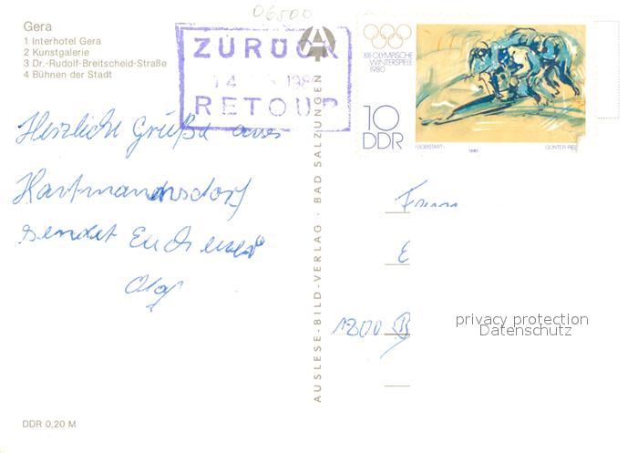 73042448 alte Postkarte Gera Interhotel Gera Kunstgalerie Dr Rudolf Breitscheid Strasse Buehnen der Stadt Wappen postalisch gelaufen Erhaltung siehe scans [FriedD77] KatCode: 11110016052000