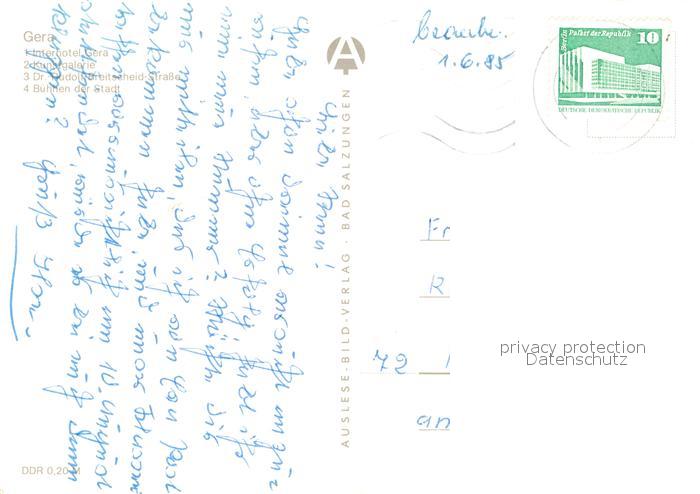 73124134 alte Postkarte Gera Interhotel Gera Kunstgalerie Rudolf Breitscheid Strasse postalisch gelaufen Erhaltung siehe scans [LiesaD40] KatCode: 11110016052000