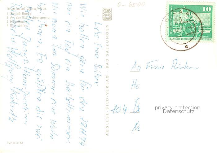 73059160 alte Postkarte Gera Interhotel Gera Schloss Burgk Bleilochtalsperre Hotelhalle Bierhoehler postalisch gelaufen Erhaltung siehe scans [WerneD78] KatCode: 11110016052000