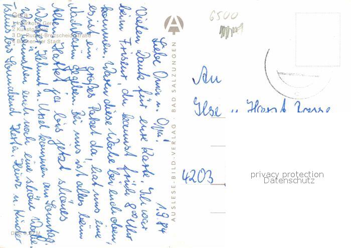 72749720 alte Postkarte Gera Interhotel Kunstgalerie Rudolf Breitscheid Strasse Brunnen postalisch gelaufen Erhaltung siehe scans [KathaD81] KatCode: 11110016052000