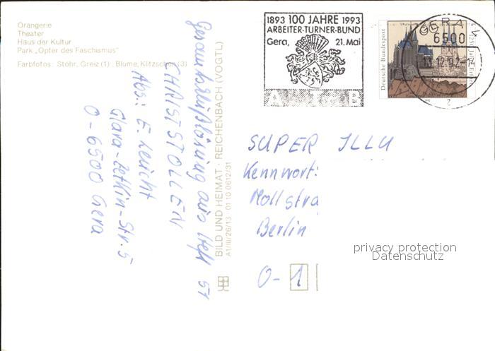 72276661 alte Postkarte Gera Orangerie Theater Haus der Kultur postalisch gelaufen Erhaltung siehe scans KatCode: 11110016052000