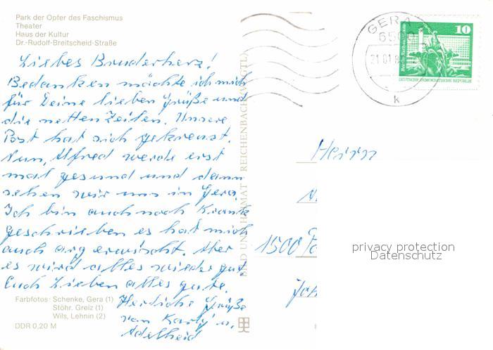 72919692 alte Postkarte Gera Park der Opfer des Faschismus Theater Haus der Kultur Dr Rudolf Breitscheid Strasse Hochhaus postalisch gelaufen Erhaltung siehe scans [FriedD77] KatCode: 11110016052000