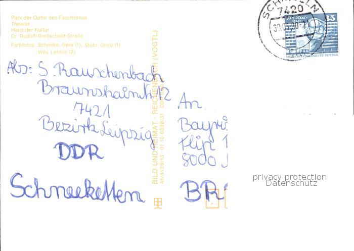 72414906 alte Postkarte Gera Park Opfer Faschismus Theater Haus der Kultur postalisch gelaufen Erhaltung siehe scans KatCode: 11110016052000
