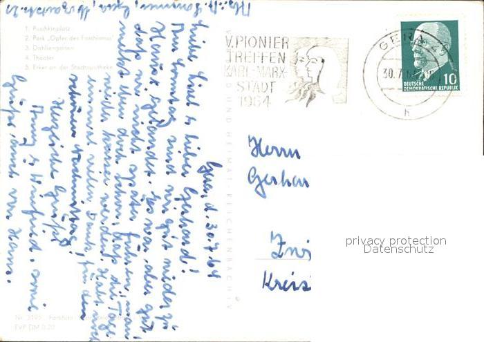 72323977 alte Postkarte Gera Puschkinplatz Park Dahliengarten Theater Erker Stadtapotheke postalisch gelaufen Erhaltung siehe scans KatCode: 11110016052000