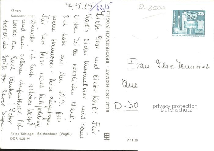 72136575 alte Postkarte Gera Simsonbrunnen postalisch gelaufen Erhaltung siehe scans KatCode: 11110016052000