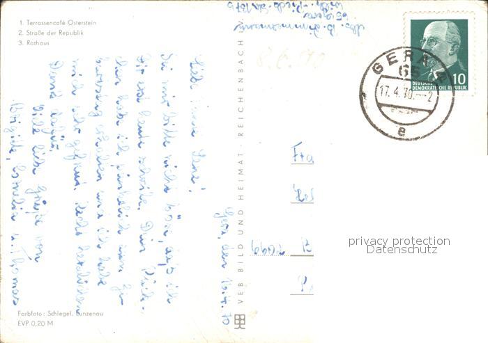 72114951 alte Postkarte Gera TerrassenCafe Osterstein Strasse der Republik Rathaus postalisch gelaufen Erhaltung siehe scans KatCode: 11110016052000