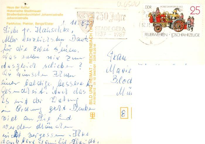73938602 alte Postkarte Gera Thueringen Haus der Kultur Historische Stadtmauer Strassenbahndurchfahrt Johannisstrasse postalisch gelaufen Erhaltung siehe scans [WerneD78] KatCode: 11110016052000
