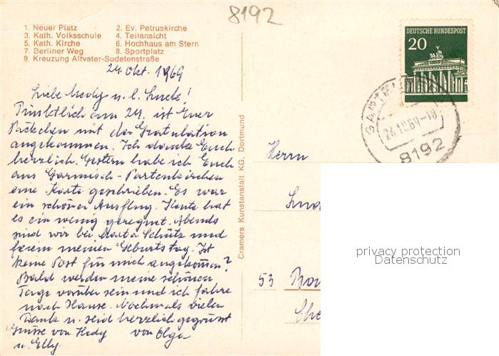 73871530 alte Postkarte Geretsried Neuer Platz Kath Volksschule Kath Kirche Berliner Weg Kreuzung Altvater Sudetenstr Ev Petruskirche Teilansicht Hochhaus am Stern Sportplatz postalisch gelaufen Erhaltung siehe scans [WerneD78] KatCode: 11110009173126