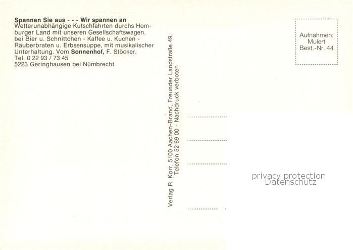 73760423 Geringhausen Pension Sonnenhof Pferdebus postalisch nicht gelaufen Erhaltung siehe scans [FriedD77] KatCode: 11110005374032