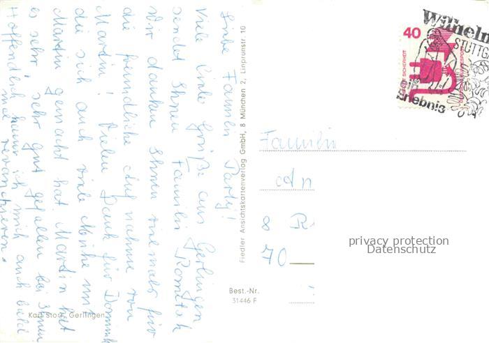 74024713 alte Postkarte Gerlingen Stuttgart BW Park Reh Skulptur Blick vom Schlossberg Loewe Petruskirche Brunnen St. Peter und Paul Kirche postalisch gelaufen Erhaltung siehe scans [FriedD77] KatCode: 11110008118019