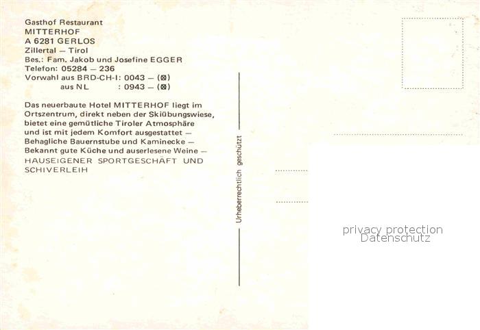 72714506 Gerlos Gasthof Restaurant Mitterhof postalisch nicht gelaufen Erhaltung siehe scans [FriedD77] KatCode: 11390335070912