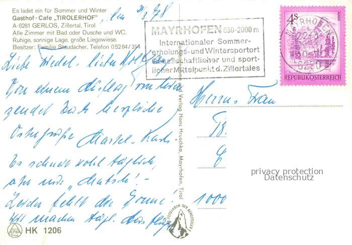 74096429 alte Postkarte Gerlos Zillertal Tirol AT Gasthof Cafe Tirolerhof postalisch gelaufen Erhaltung siehe scans [WerneD78] KatCode: 11390335070912