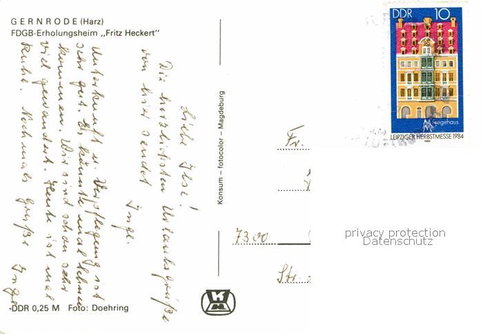 72844679 alte Postkarte Gernrode Harz FDGB Erholungsheim Fritz Heckert postalisch gelaufen Erhaltung siehe scans [KathaD81] KatCode: 11110015085120