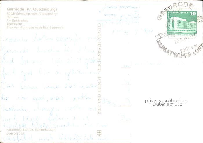 72174413 alte Postkarte Gernrode Harz FDGB Erholungsheim Stubenberg Rathaus Spittelplatz postalisch gelaufen Erhaltung siehe scans KatCode: 11110015085120