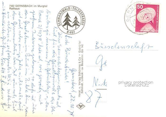 73070047 alte Postkarte Gernsbach Rathaus postalisch gelaufen Erhaltung siehe scans [WerneD78] KatCode: 11110008216017
