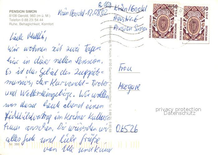 73082938 alte Postkarte Gerold Pension Simon Alpenblick postalisch gelaufen Erhaltung siehe scans [FriedD77] KatCode: 11110009180122