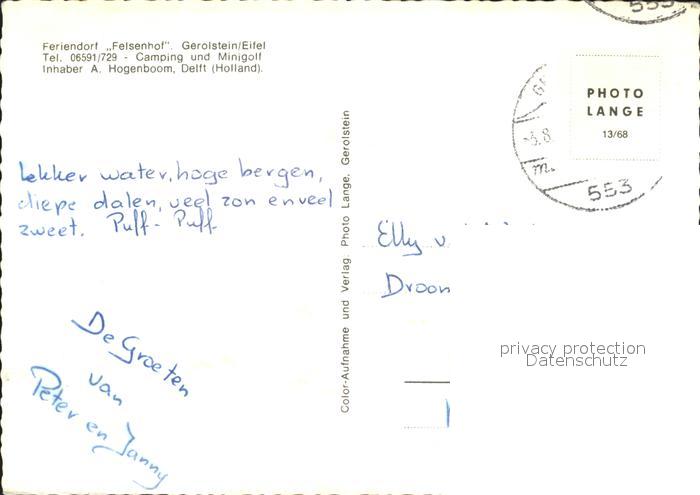 72241936 alte Postkarte Gerolstein Rheinland-Pfalz Felsenhof Camping postalisch gelaufen Erhaltung siehe scans KatCode: 11110007233026
