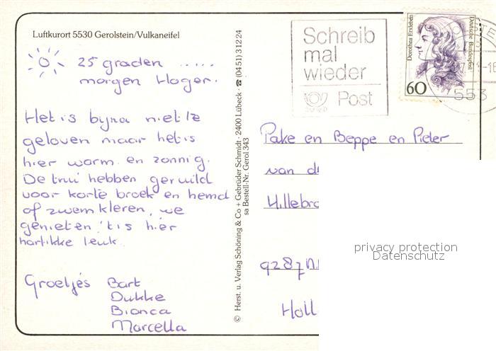 72955809 alte Postkarte Gerolstein Rheinland-Pfalz Gesamtansicht Luftkurort Partie am Wasser Kirche Kurhaus Park Platz postalisch gelaufen Erhaltung siehe scans [FriedD77] KatCode: 11110007233026