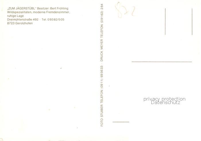 73867150 Gerolzhofen Gaestehaus Pension zum Jaegerstuebl Fremdenzimmer postalisch nicht gelaufen Erhaltung siehe scans [FriedD77] KatCode: 11110009678134
